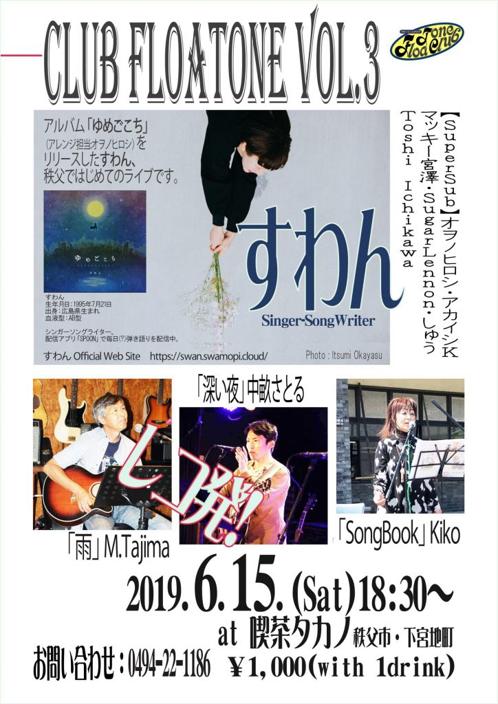 Club FloaTone vol.3 2019年6月15日 土曜日 @ 6:30 PM 秩父市, 埼玉県, 日本 入場料1,000円が必要です(1ドリンク付)。 Gig Details Admission: 1,000円 Get Directions Venue Details Address 喫茶タカノ 埼玉県秩父市下宮地町10−19秩父市, 埼玉県 368-0021日本494-22-1186 Phone: 494-22-1186 Website: tabelog.com/saitama/A1107/A110701/11013503 アルバム「ゆめごこち」のギターアレンジで参加いただいたオヲノヒロシさん主催の主催によるミニライブ。 会場: 喫茶タカノ 住所/埼玉県秩父市下宮地町10-19 電話番号/0494-22-1186